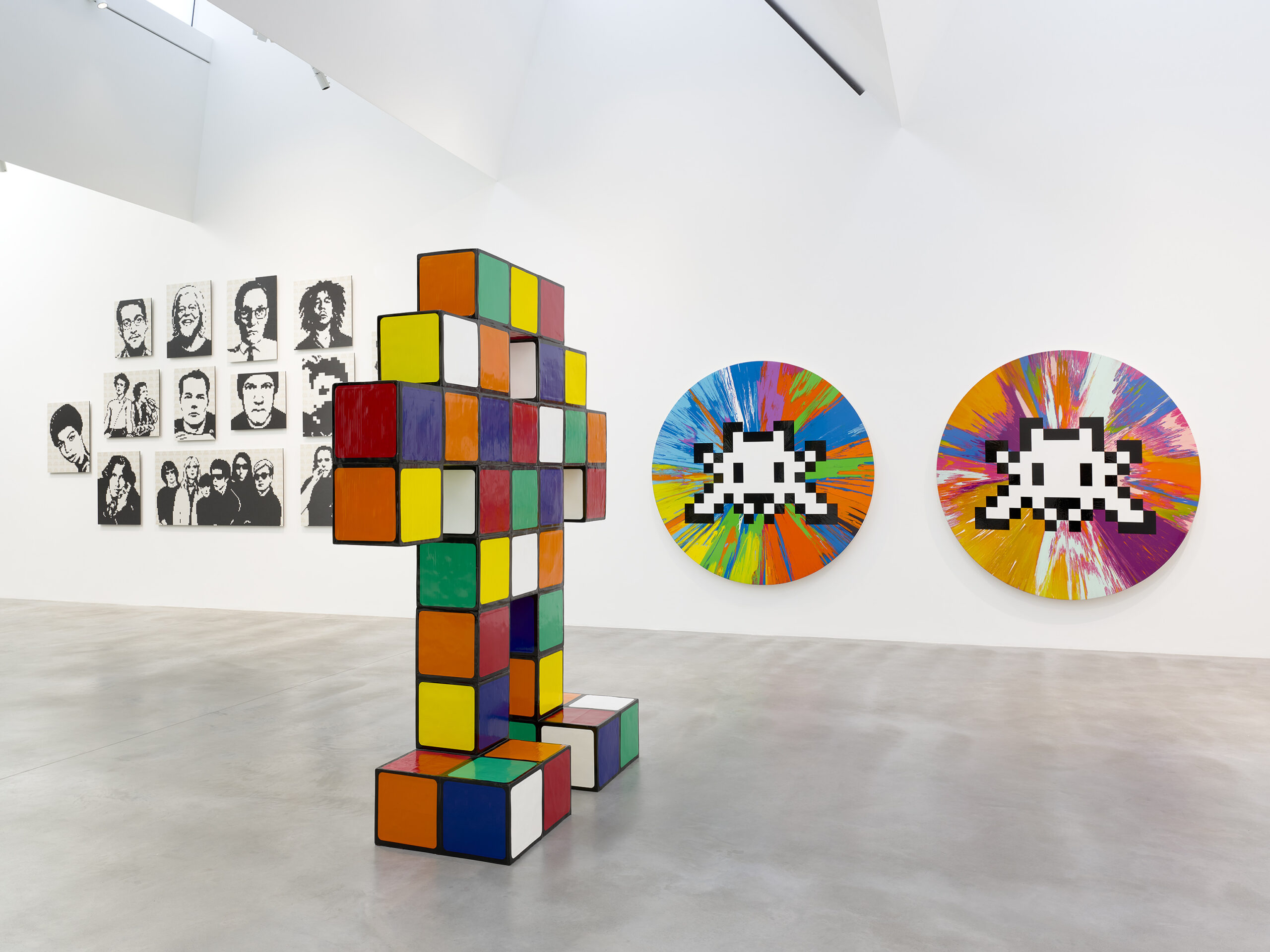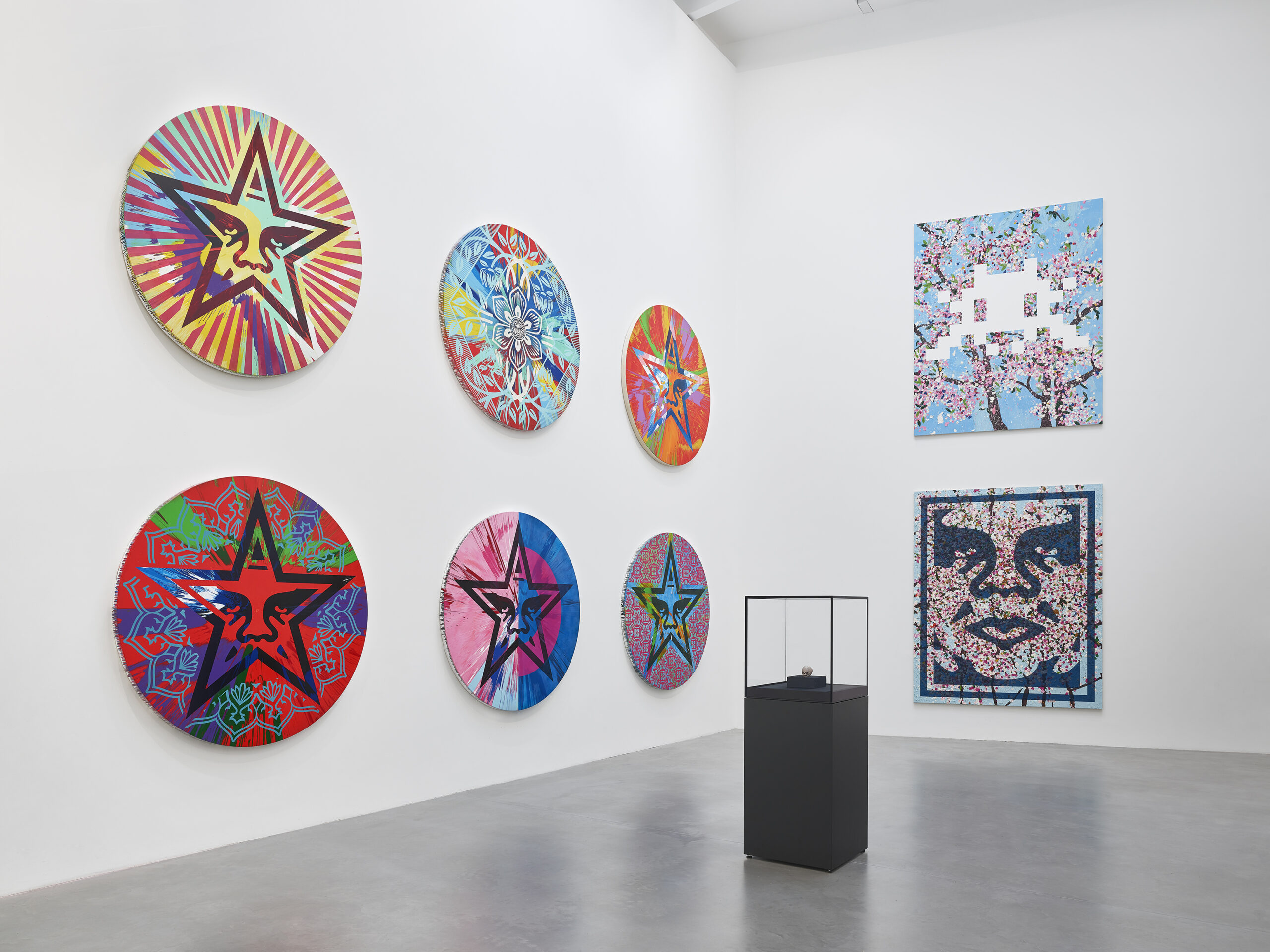 an exhibition of new collaborative works by Shepard Fairey, Damien Hirst, and Invader